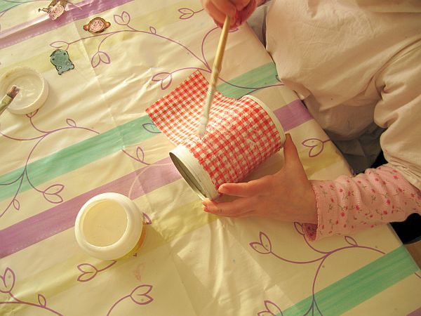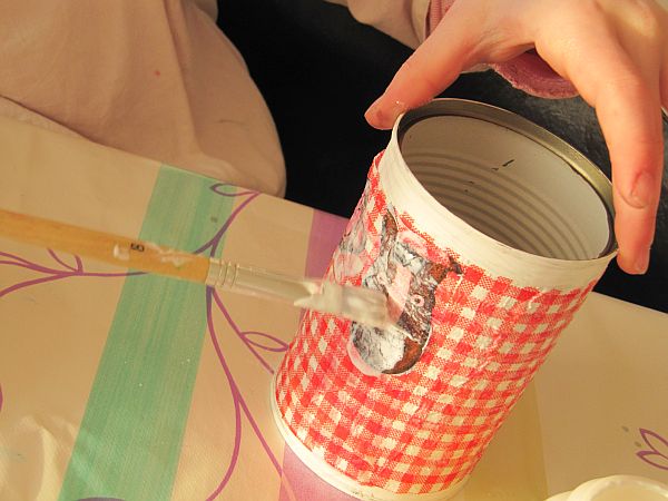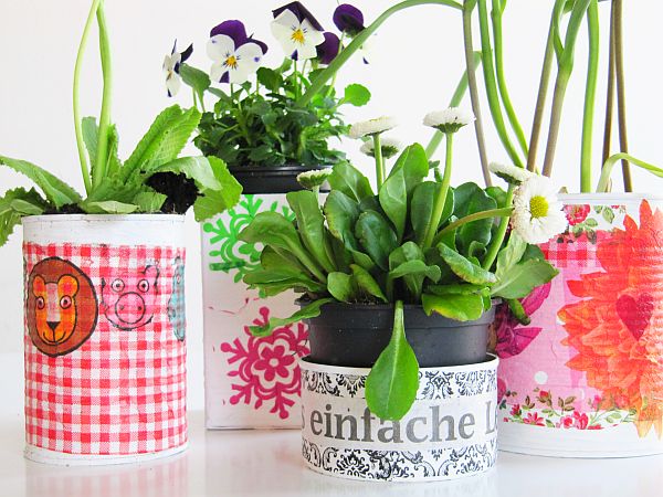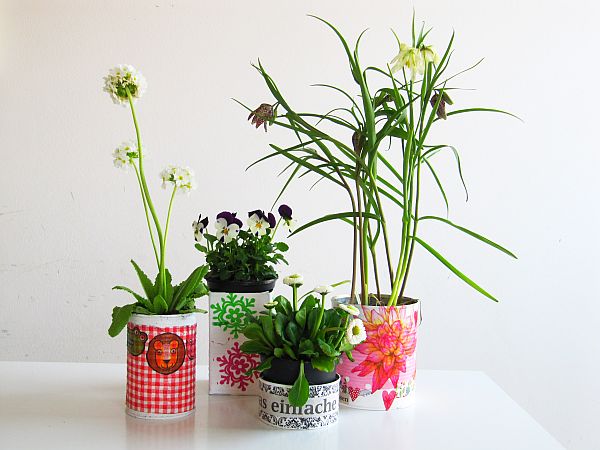 Diesmal haben die kleine Miss und ich mit Serviettenkleber aus unserem Dosenschrott ganz schnell ein paar Töpfchen für unseren Tischfrühlingsgarten gemacht. Die Dosen haben wir erst mit Dispersionsfarbe weiß gestrichen und anschließend mit Serviettenpatchwork verziert. Man kann aber auch jedes andere Papier verwenden. Bilder aus Zeitschriften oder Zeitungstypo wirken auch sehr schön.