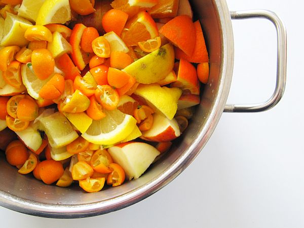 Zutaten: 675 g säuerliche Äpfel, gehackt mit Schale und Kernen, 4 große unbehandelte Orangen, gewaschen und mit Schale gekhackt, 1 große unbehandelte Zitrone, gewaschen und mit Schale gehackt, ca. 1,5 kg brauner Zucker oder Gelierzucker.