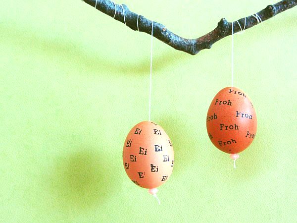Mit hochrotem Kopf habe ich Eier ausgepustet und rundherum gestempelt. Nicht so einfach, auf der gekrümmten Schale längere Wörter in einem Rutsch aufzudrucken. Zum Glück stehen zu Ostern die eher kurzen Worte zur Verfügung. Weihnachten wäre da deutlich ungeeigneter.