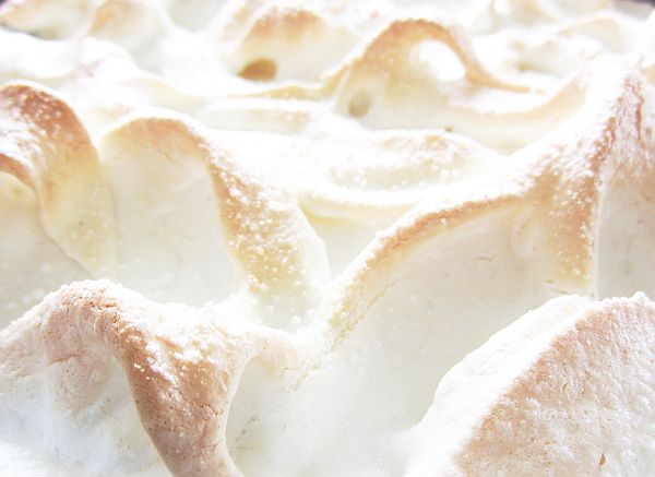 Während der Boden im Ofen bäckt das Baiser vorbereiten. Dafür die drei Eiweiß und den Zitronensaft fest aufschlagen bis der Eischnee Spitzen zieht. Den Zucker einrieseln lassen und weiter aufschlagen.