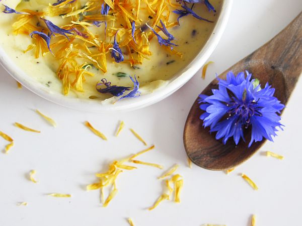 Unter einen halben Riegel weiche Butter mischt die Gabel Salz, Pfeffer, Rosmarin, Lavendelblüten, Thymian, Salbei, Petersilie, alles fein gewiegt, wer gerne noch den Knoblauch mit im Bunde will, der gibt eine Zehe in Würfelchen bei. In eine kleine Schale füllen, in Blütenblätter von Korn- und Ringelblume gewanden und eine gute Stunde kühlen.